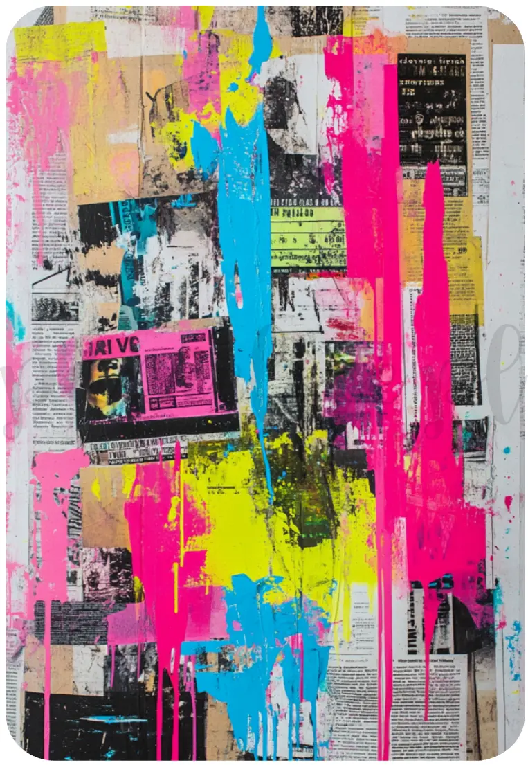 jedną dużą naklejkę z tłem z jaskrawą farbą na gazetach.