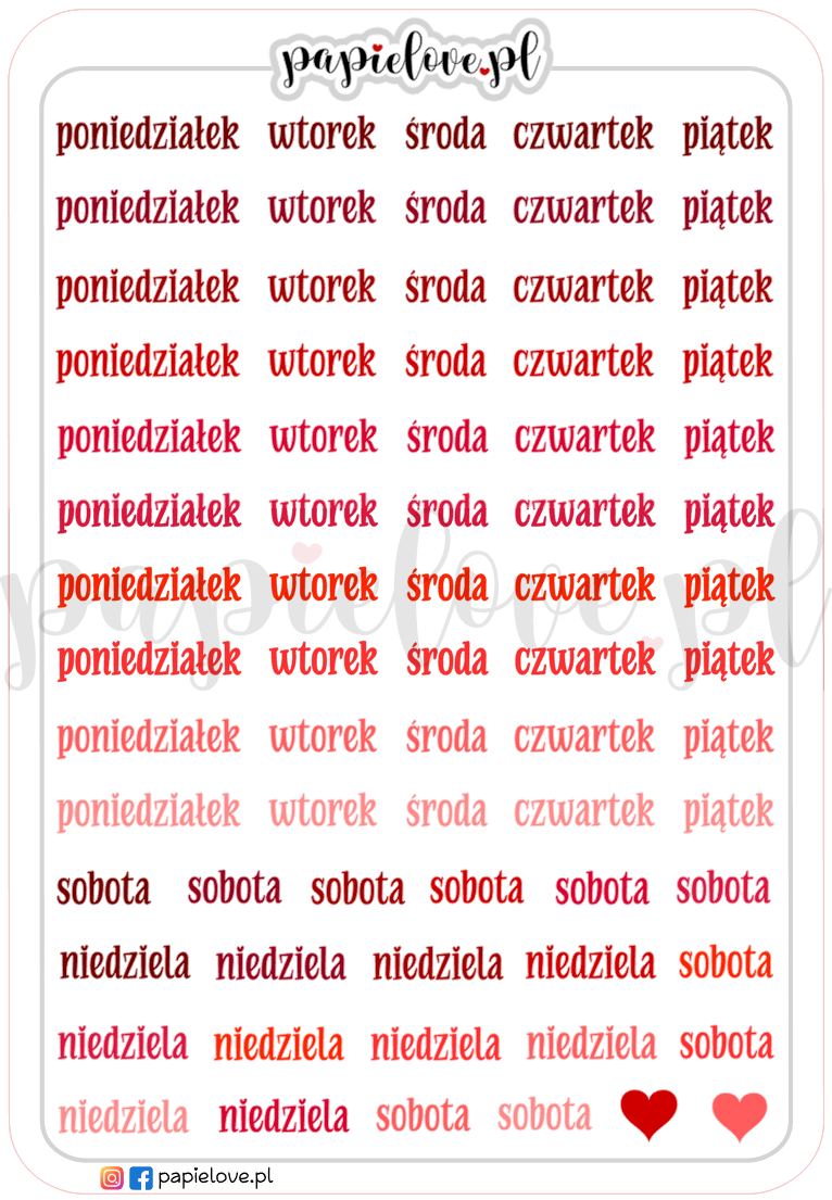 Arkusz naklejek z dniami tygodnia w dziesięciu odcieniach czerwieni.