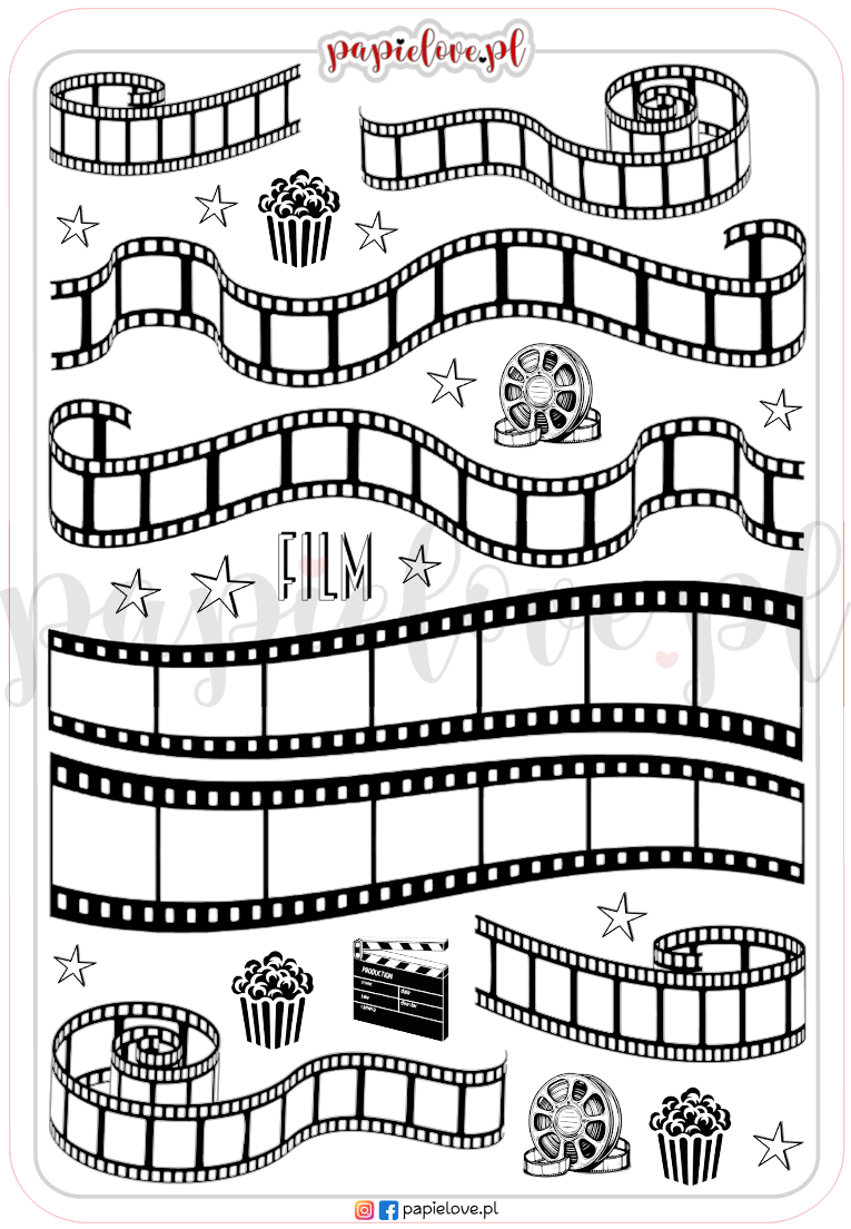 Arkusz naklejek o tematyce filmów i seriali, stworzony z myślą o miłośnikach seansów i kreatywnych zapisków. Idealny do journali, planerów i dzienników filmowych oraz do ozdabiania trackerów filmów i seriali.