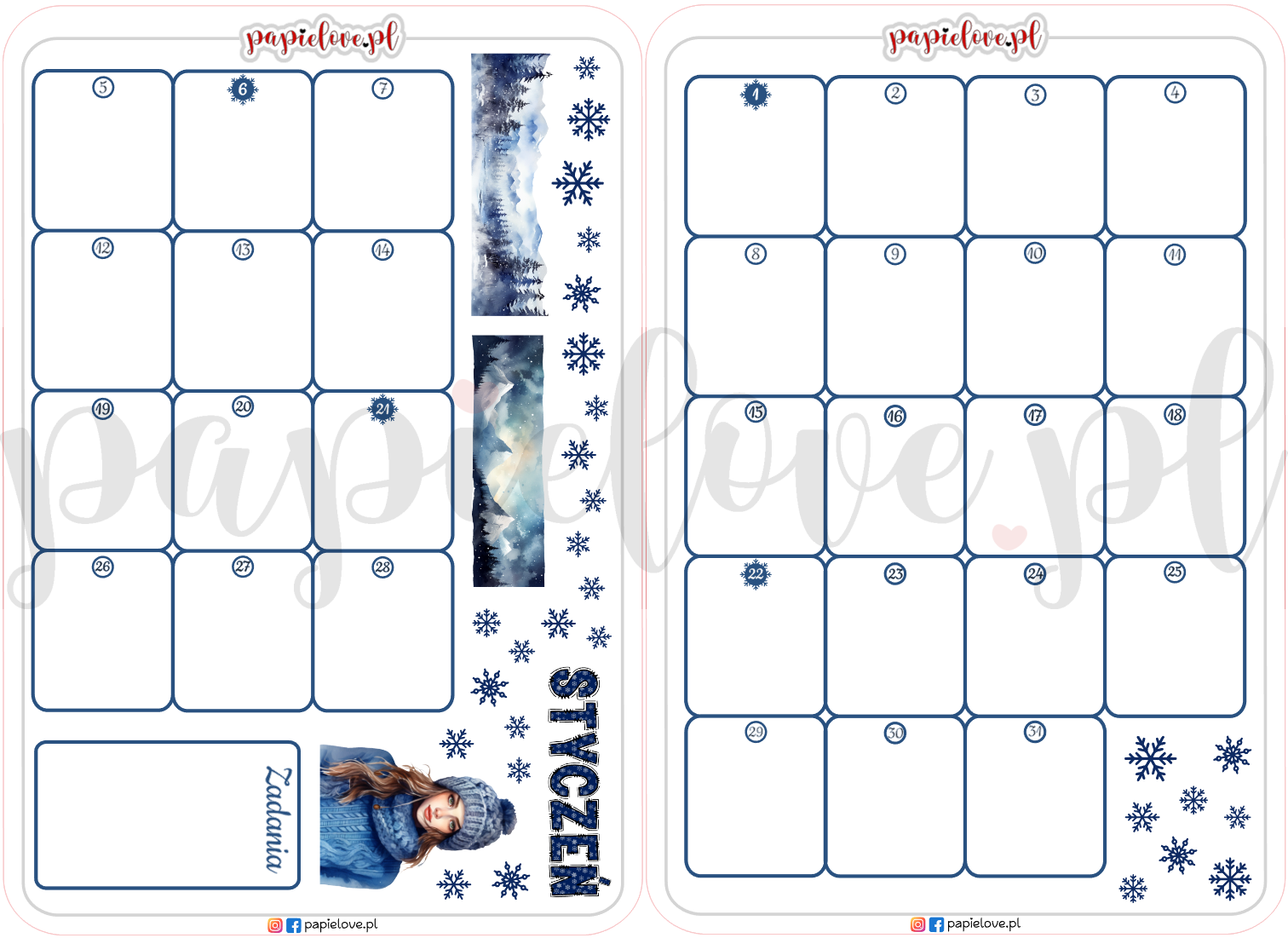 nazwę miesiąca oraz naklejki i śnieżynki do ozdobienia obu stron.