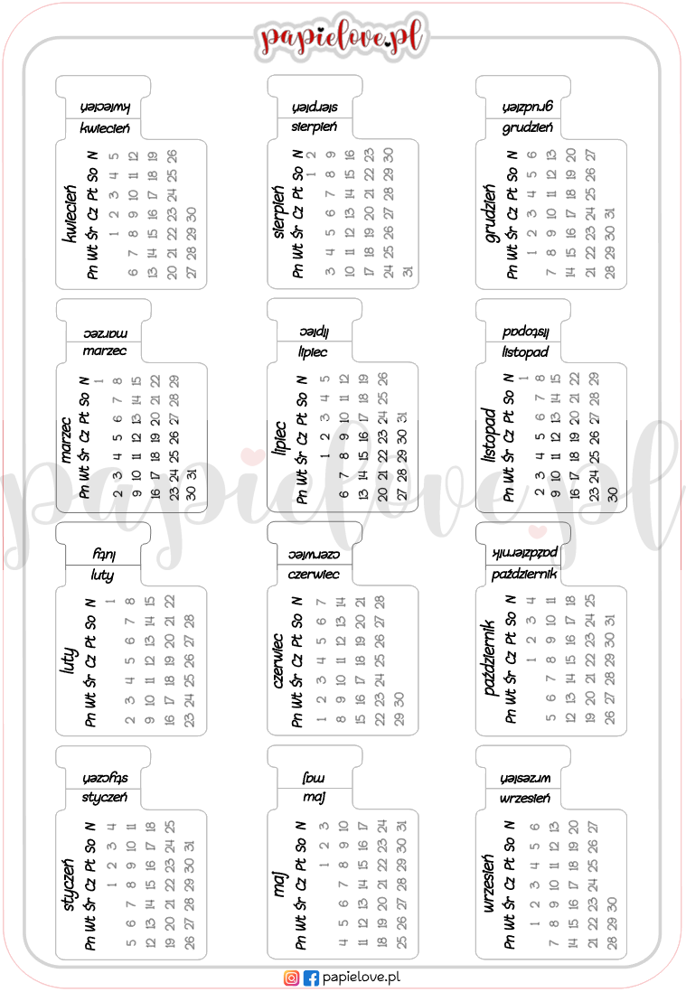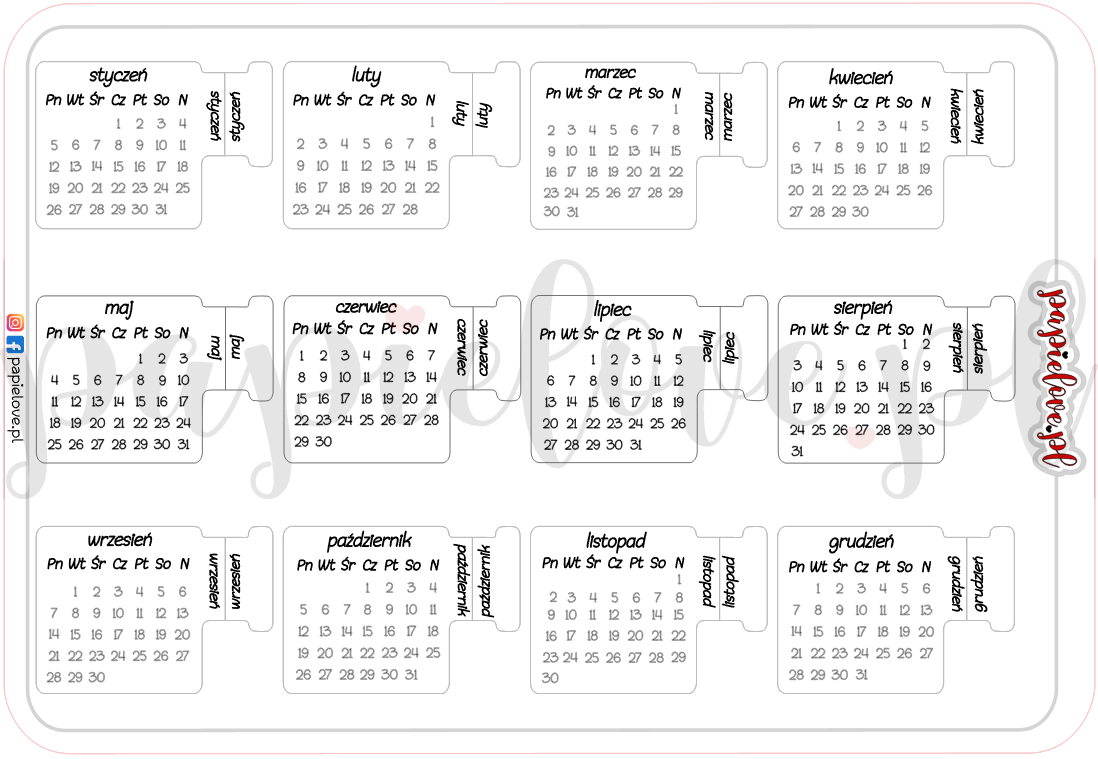 Arkusz naklejek z kalendarzami na 2026 rok ze znacznikami.