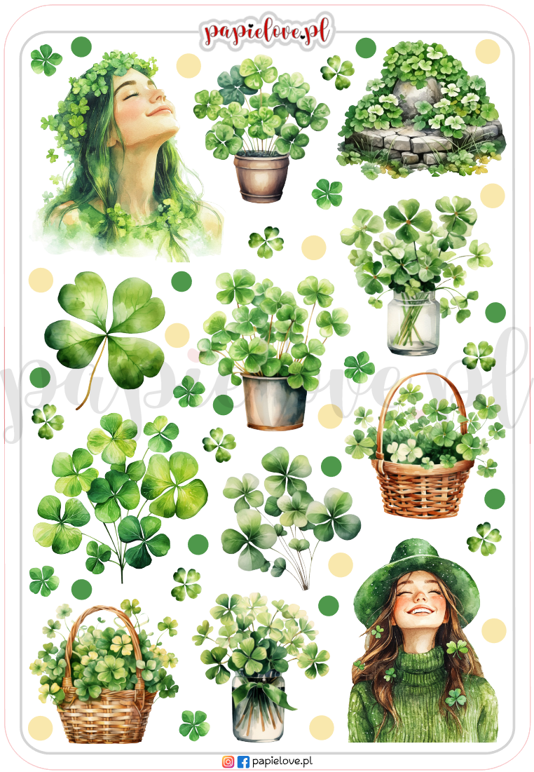 12 naklejek z koniczyną oraz mini koniczynki i kropeczki do ozdoby.