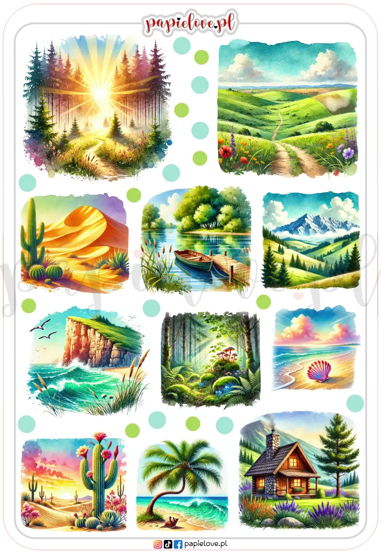 Arkusz naklejek z krajobrazami to kolekcja pełna natury i inspirujących widoków. Idealne do bullet journala, plannerów i dekoracji. Różnorodne pejzaże dodadzą uroku i wyjątkowego charakteru każdej stronie.