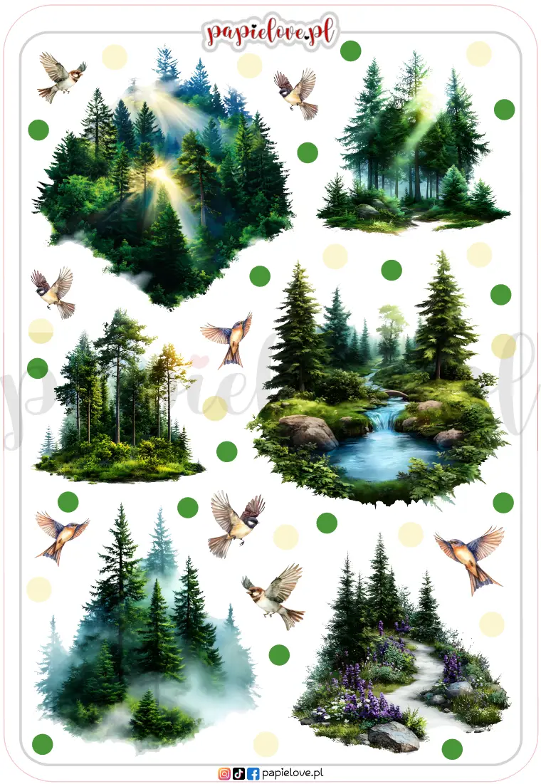 zawiera 6 naklejek z motywem lasu, leśnych ścieżek i rzeki