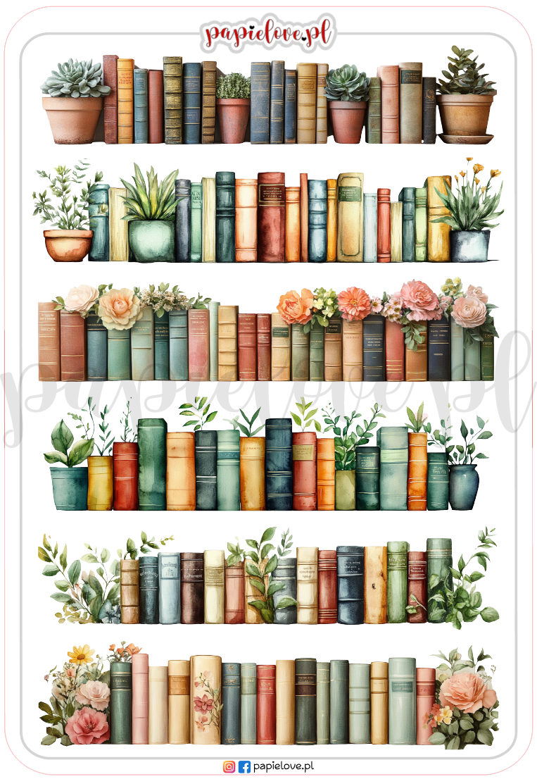 6 naklejek czytelniczych z półkami pełnymi książek.