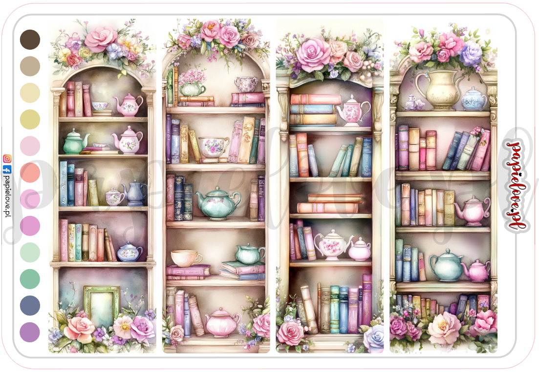4 naklejki czytelnicze z regałami pełnymi książek.