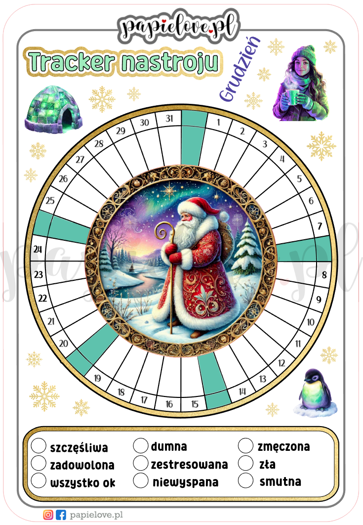 Tracker nastroju, inaczej mood tracker lub śledzik to narzędzie, które pomaga śledzić i monitorować emocje i nastrój na przestrzeni czasu. Dzięki takiemu trackerowi nastroju możesz zauważyć zmiany w swoim samopoczuciu, zidentyfikować czynniki wpływające na określone emocje oraz śledzić skutki działań podejmowanych w celu poprawy swojego samopoczucia. Sięgnij po nasze arkusze naklejek z trackerem nastroju przygotowane do wyboru kolejne miesiące roku: tu na miesiąc grudzień z serii Zorza Polarna.