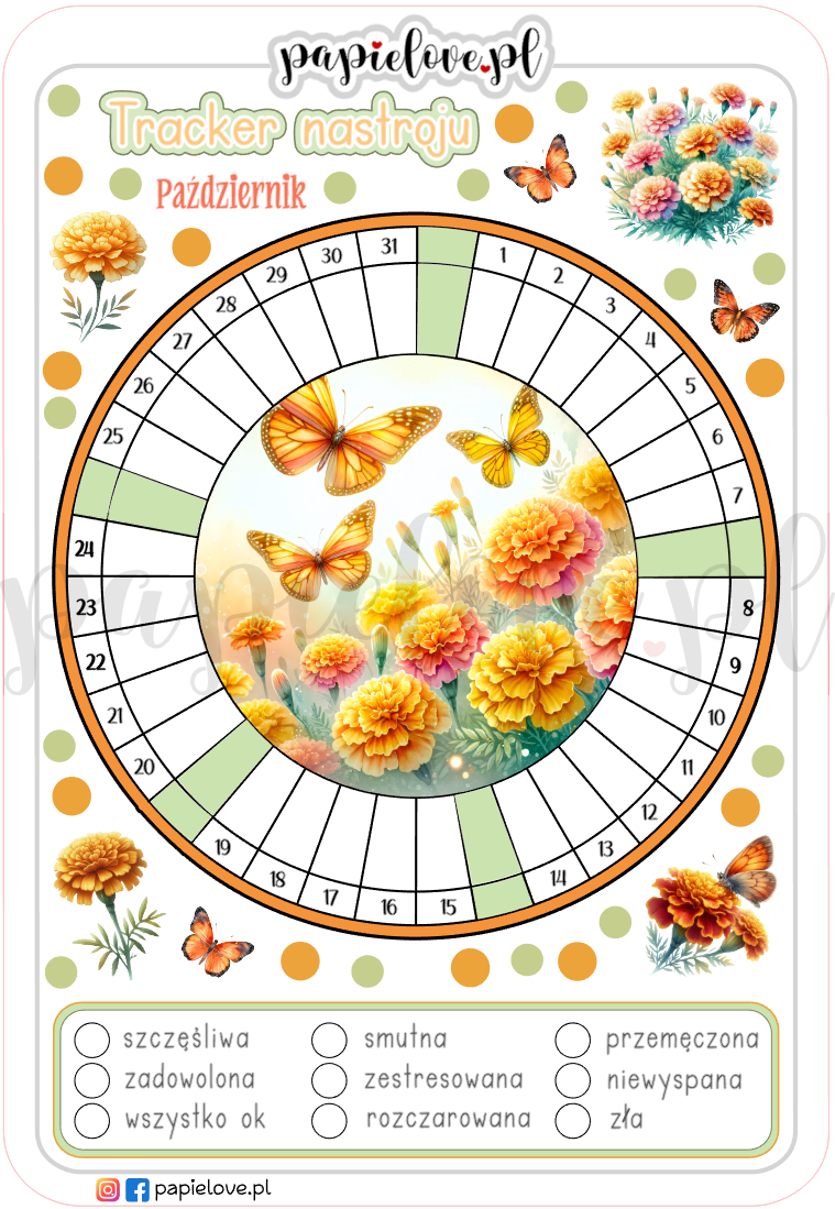 Tracker nastroju, inaczej mood tracker lub śledzik to narzędzie, które pomaga śledzić i monitorować emocje i nastrój na przestrzeni czasu. Dzięki takiemu trackerowi nastroju możesz zauważyć zmiany w swoim samopoczuciu, zidentyfikować czynniki wpływające na określone emocje oraz śledzić skutki działań podejmowanych w celu poprawy swojego samopoczucia. Sięgnij po nasze arkusze naklejek z trackerem nastroju przygotowane do wyboru kolejne miesiące roku: tu na miesiąc październik.