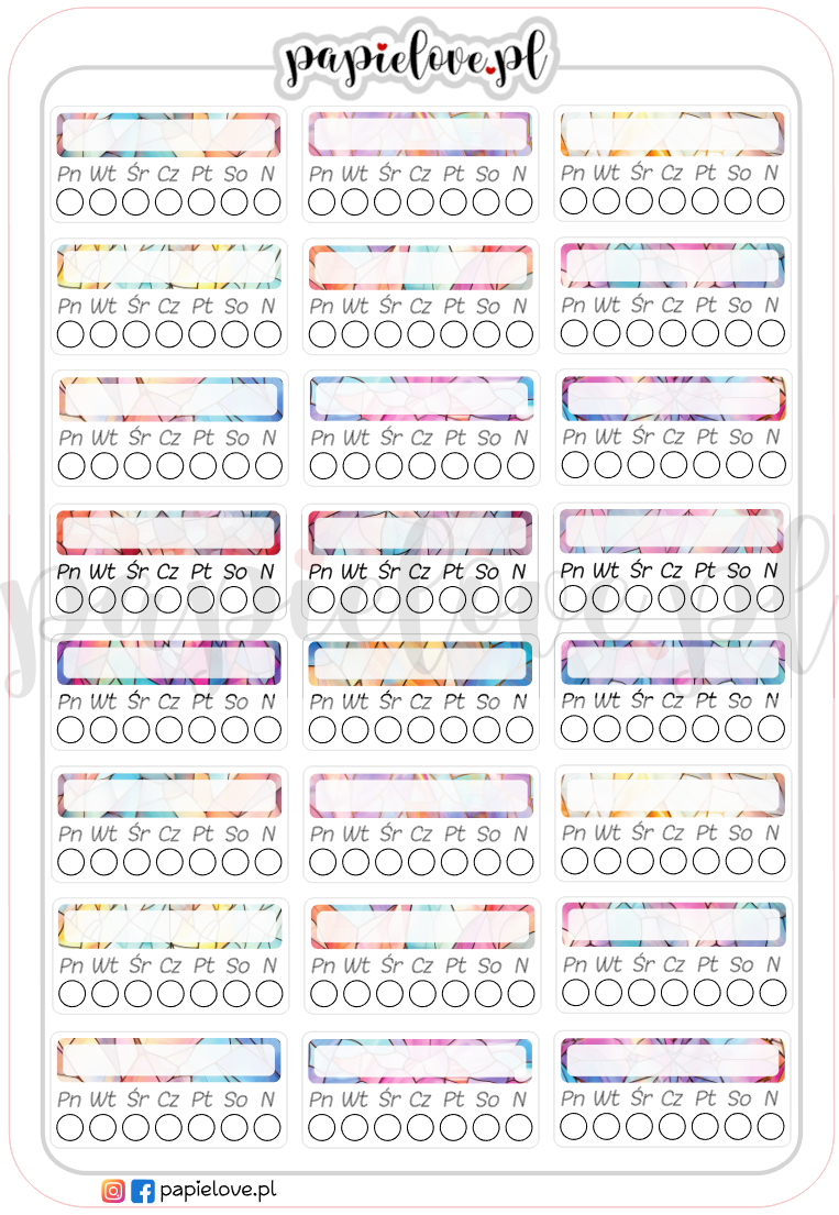Tracker to narzędzie, dzięki któremu możesz śledzić swoje postępy w rozwijaniu pozytywnych nawyków, zauważać wzorce w swoim zachowaniu, motywować się do kontynuowania praktyk oraz identyfikować obszary do poprawy. Jest to również przydatne narzędzie do budowania dyscypliny i regularności w wykonywaniu codziennych czynności. Nasz arkusz naklejek pozwala samodzielnie wybrać i wpisać w odpowiednie pola nawyki i zwyczaje, które chcesz monitorować. Każdego dnia wypełniaj puste pola znaczkami lub zamalowuj kolorowymi kredkami. Systematyczność jest bardzo ważna.