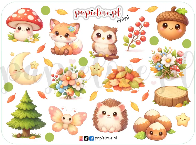 14 naklejek z motywem lasu i zwierzątek oraz liście, gwiazdki i kropeczki.