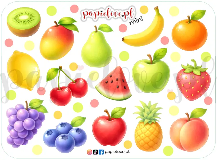 15 naklejek z owocami oraz kropeczki do ozdoby.