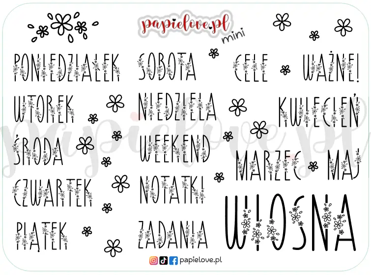 16 naklejek z kwiatowymi napisami oraz kwiatuszki do ozdoby.