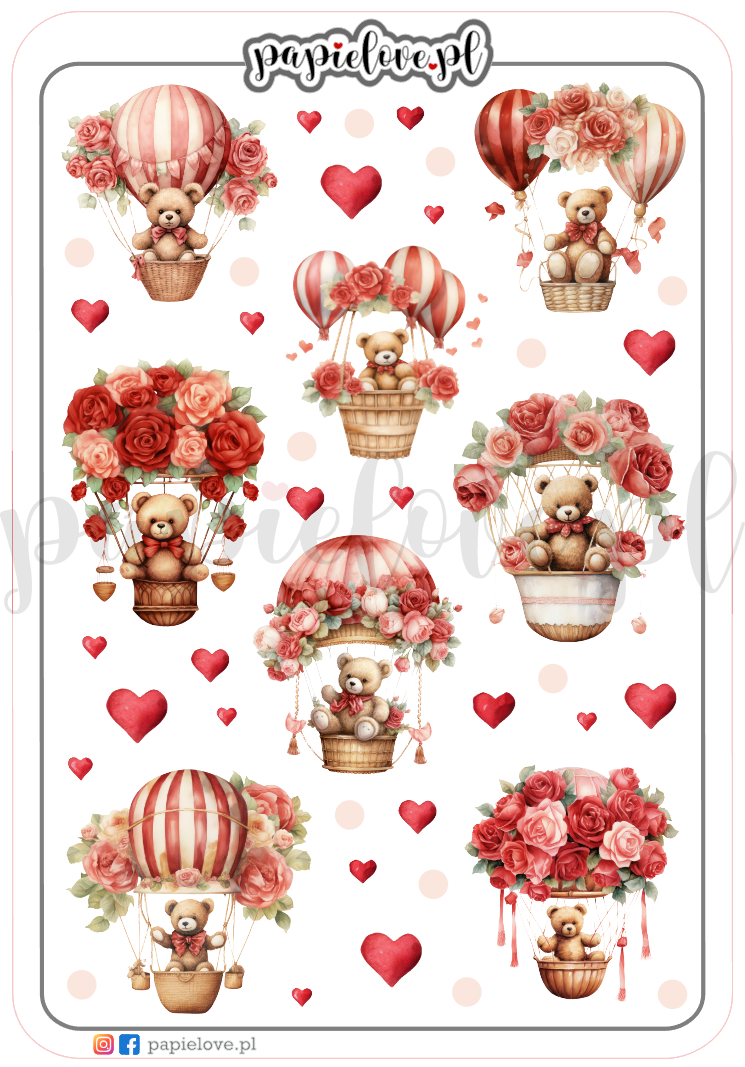 8 naklejek walentynkowych z misiami w balonach z różami oraz serduszka i kropeczki.