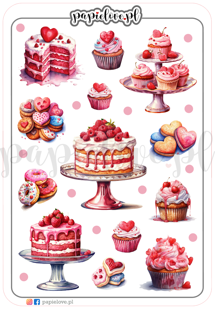 13 naklejek walentynkowych ze słodkościami i kropeczki o średnicy 0,5 cm.