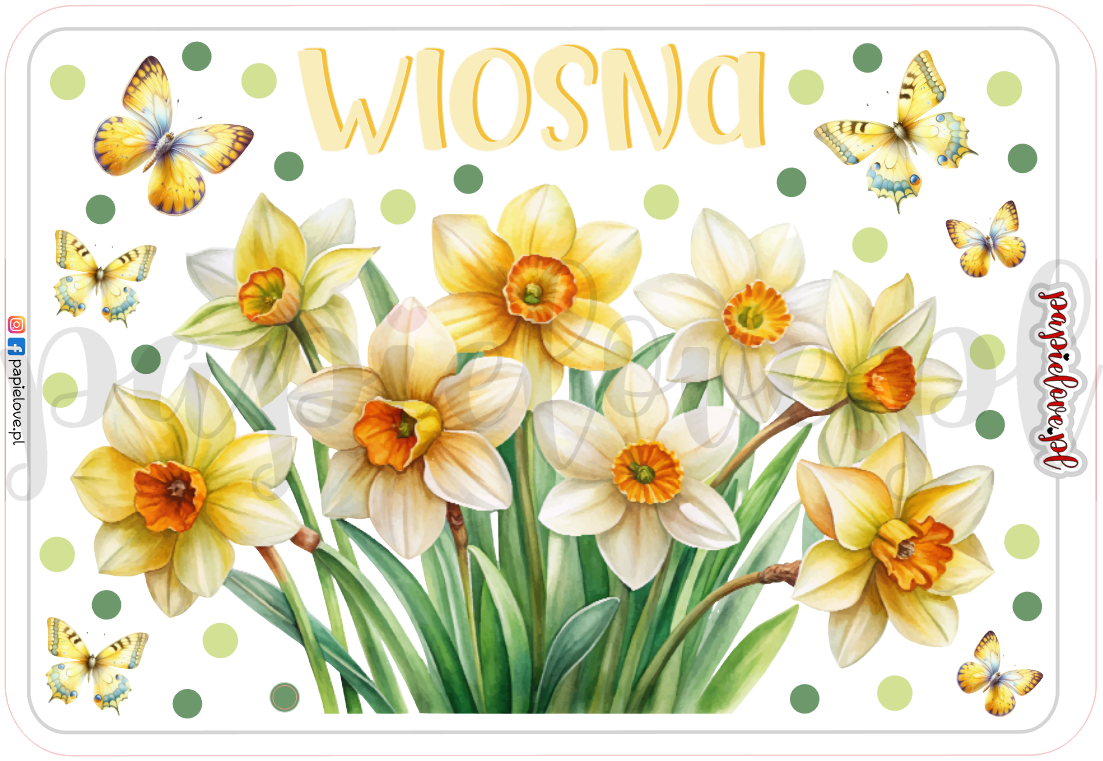 jeden duży napis, jeden wiosenny obrazek z żonkilami,