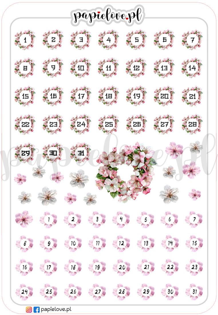 62 naklejki z cyferkami ozdobionymi kwiatami wiśni