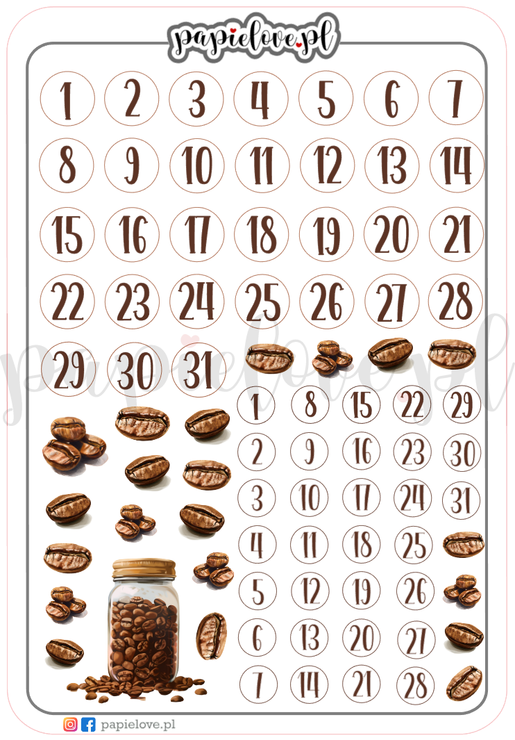 Arkusz z naklejkami na matowym papierze zawiera 62 naklejki z cyferkami oraz 21 z motywem ziaren kawy i jedną z pojemnikiem na kawę.