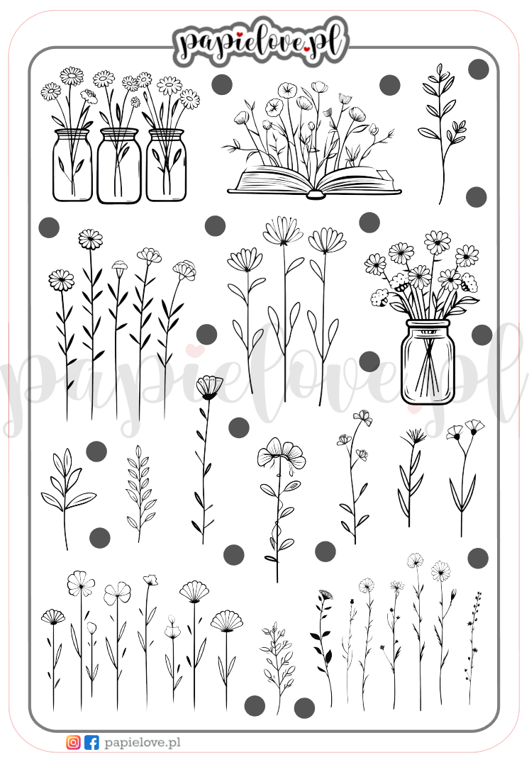 16 naklejek doodle z kwiatami i kropeczki o średnicy 0,5 cm.