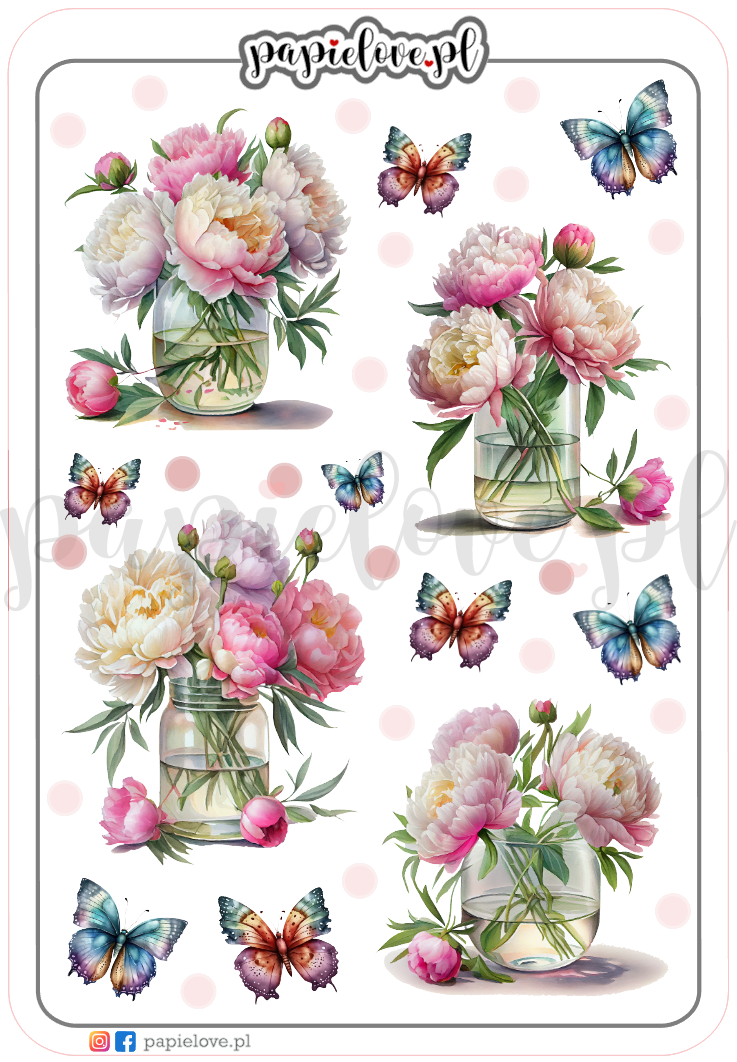 4 naklejki z peoniami w wazonie, 8 motyli i kropeczki o średnicy 0,5 cm.