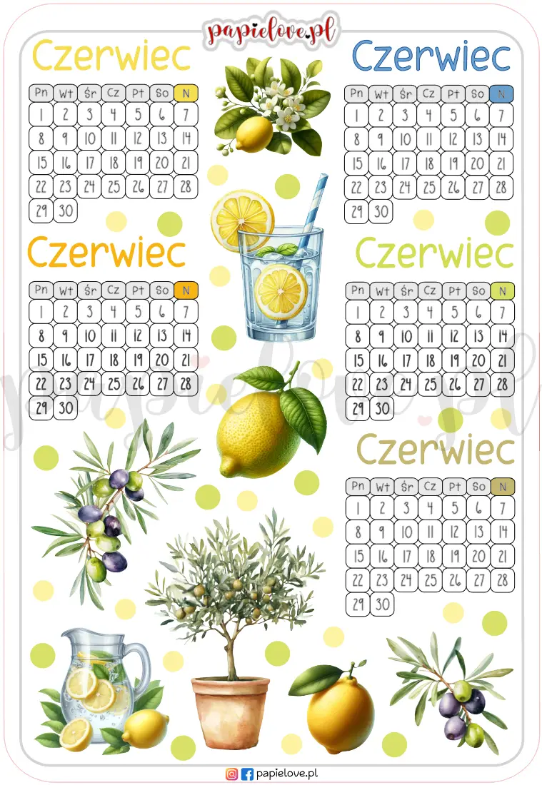 Naklejki z mini kalendarzami do planowania z cytrynami na miesiąc czerwiec 2026.