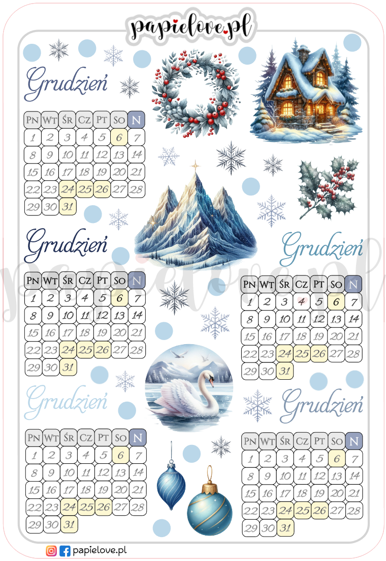 Naklejki z mini kalendarzami do planowania na miesiąc grudzień 2025.