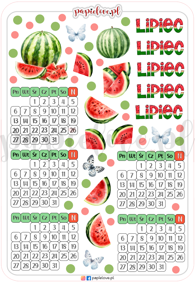 Naklejki z mini kalendarzami na lipiec 2026 - Arbuzy