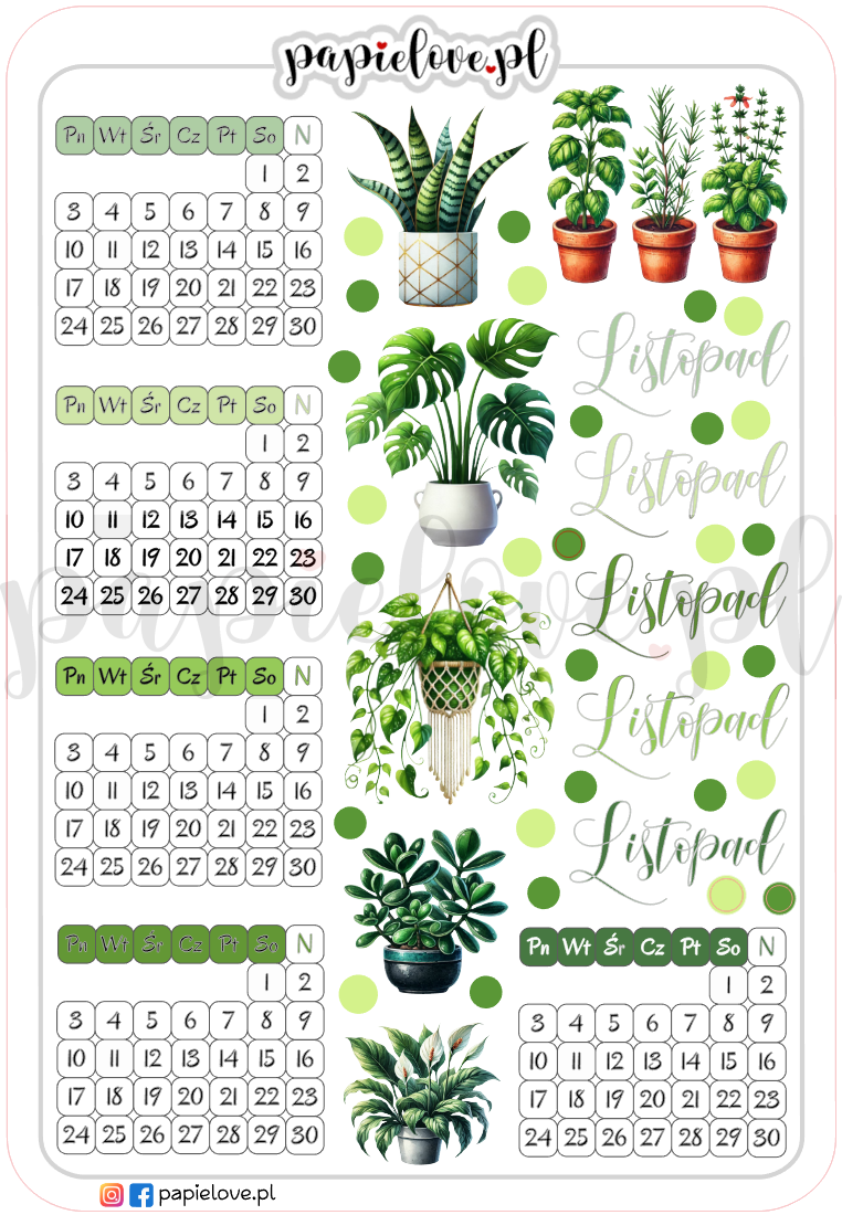 Naklejki z mini kalendarzami do planowania z motywem roślin domowych na miesiąc listopad 2025.