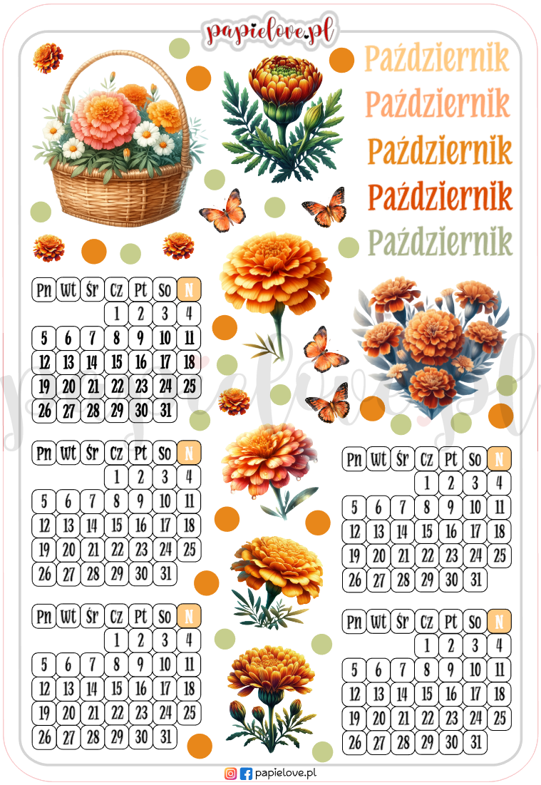 Naklejki z mini kalendarzami do planowania z aksamitkami na miesiąc październik 2026.