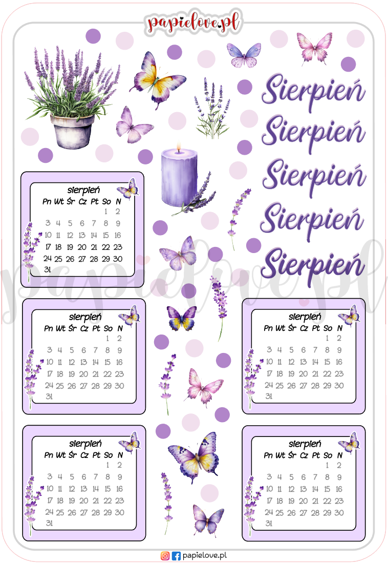 Naklejki z mini kalendarzami na sierpień 2026 - Lawenda